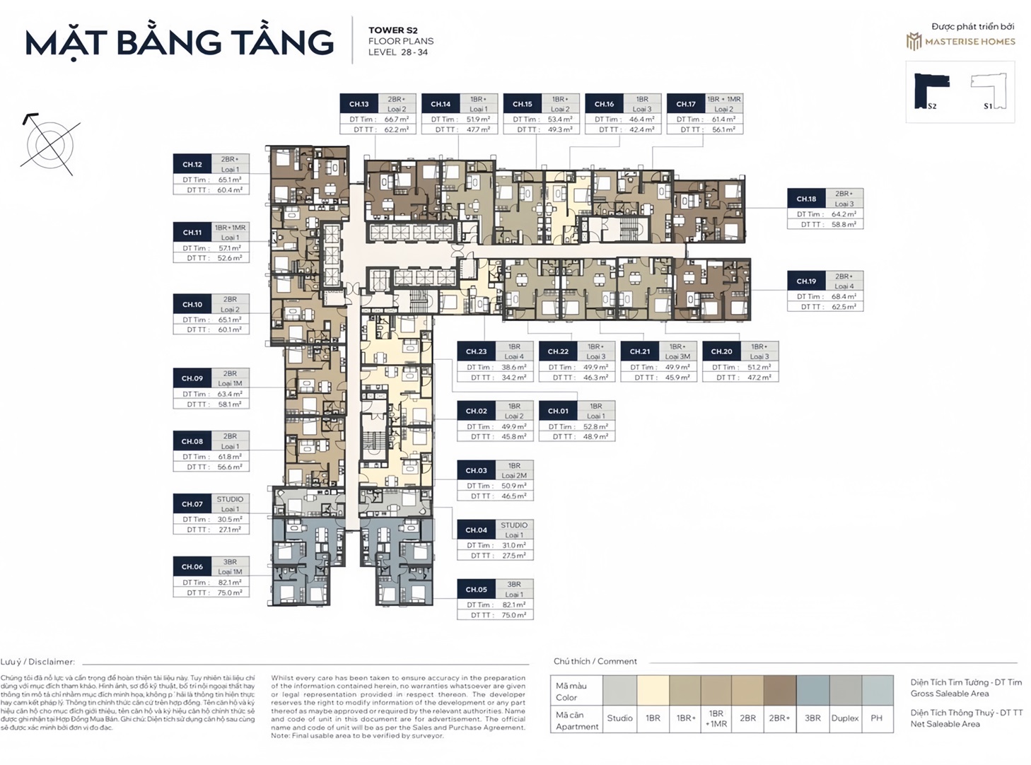 Studio: 28 – 33 m2 (2 căn/sàn)